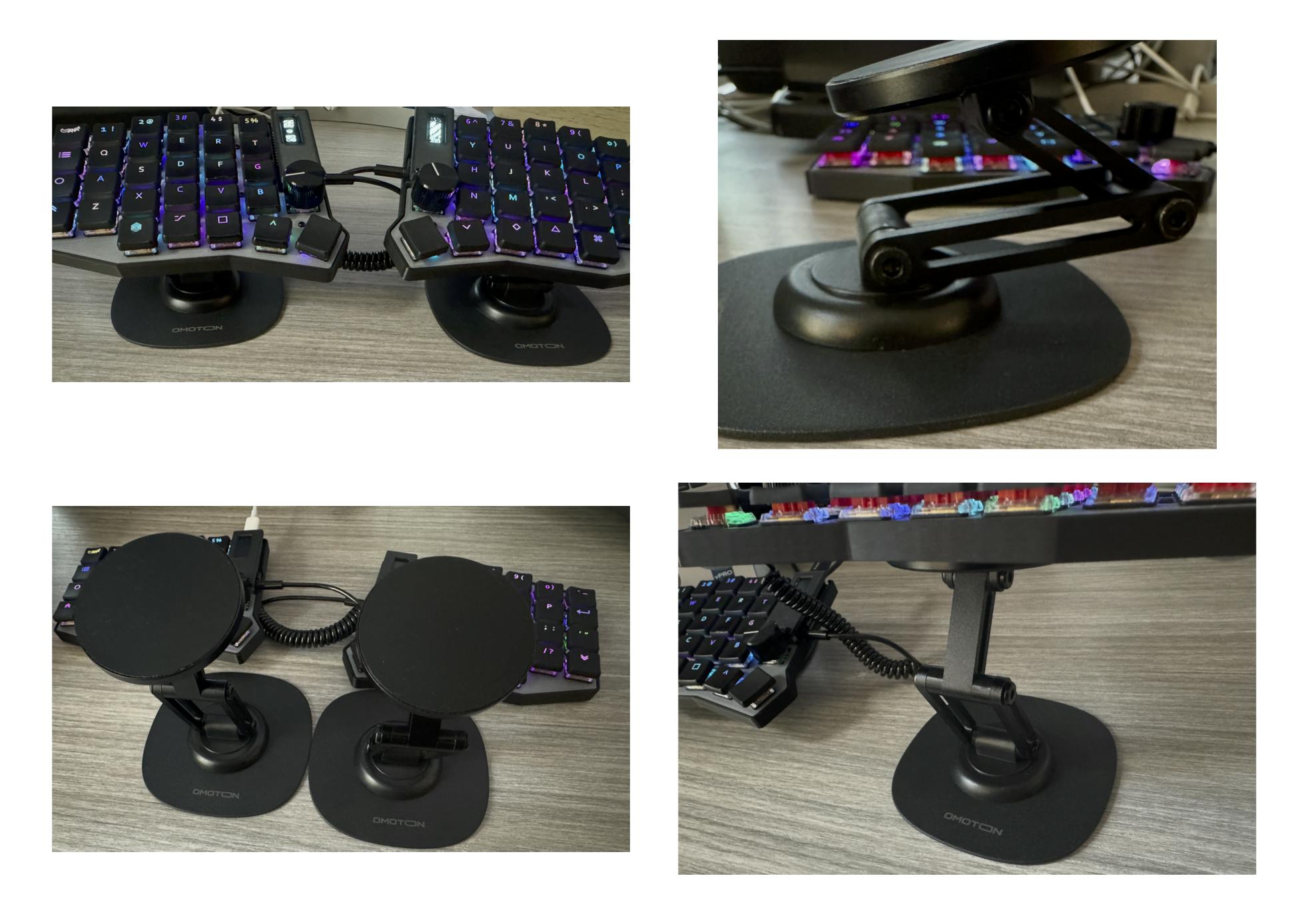 Unlike other similar tenting kits my bases do not rotate around in a 360 degree motion. This is ideal as the other mounts will rotate if you are a heavy typer. Mine do not. They are also made out of heavy metal and you can tighten them down once you find your ideal angle.